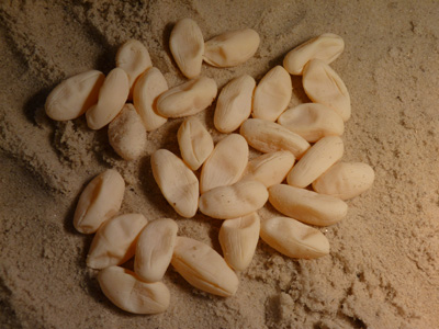 Depois que ela cavou seu buraco, ela vai colocar os ovos em menos de 30 minutos e, em seguida, passar um tempo enterrá-los novamente. O que você precisa fazer é remover cuidadosamente o solo e tomar nota da posição do ovo, transferi-los para a incubadora mantê-los na mesma posição em que foi encontrado. ( Não deve virar os ovos de répteis ) Se ela apenas colocou poucos ovos, certamente irá desovar mais dentre alguns dias.
